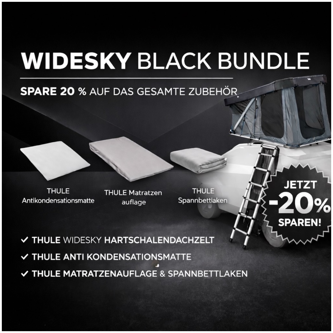 Mit dem Thule Black Bundle holst du dir das perfekte Zubehör-Set für dein Thule Widesky Hartschalendachzelt – und sparst dabei 20 % auf das gesamte Zubehör.